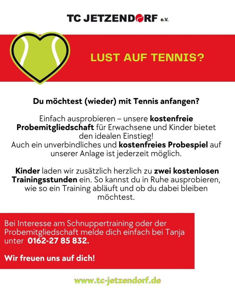 Der TC Jetzendorf e.V. bietet aktuell eine tolle Möglichkeit, unseren Verein und den Tennissport ganz unverbindlich kennenzulernen. Erwachsene dürfen einmal kostenlos auf unserer Anlage spielen – und wer danach Lust auf mehr hat, kann sich für eine kostenlose Probemitgliedschaft entscheiden. Kinder sind herzlich zu zwei kostenlosen Trainingsstunden eingeladen, um in aller Ruhe in den Tennissport hineinzuschnuppern.